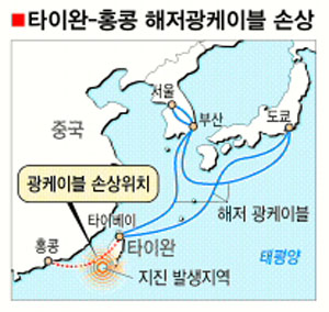 정보통신부는 27일 “한국과 타이완을 연결하는 6개 해저광케이블에 장애가 발생, 타이완간의 통신 전용회선 92회선 서비스가 중단됐다.”고 밝혔다. 이번에 손상된 광케이블은 한국∼타이완∼홍콩 구간으로, 이 구간의 전용회선을 이용하는 기업체와 은행들이 통신 장애를 겪고 있다.
