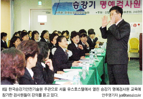 박영숙(50·여) 안전생활실천시민연합(이하 안실련) 산하 전국어머니안전지도자중앙회 회장은 8일 서울 중구 서울유스호스텔에서 열린 ‘승강기 명예검사원’ 교육장에서 이같이 말했다. 안실련 전국어머니안전지도자중앙회 109명은 이날부터 1박 2일에 걸쳐 한국승강기안전기술원 주최, 서울신문이 후원하는 첫번째 승강기 명예검사원 교육을 받는다.