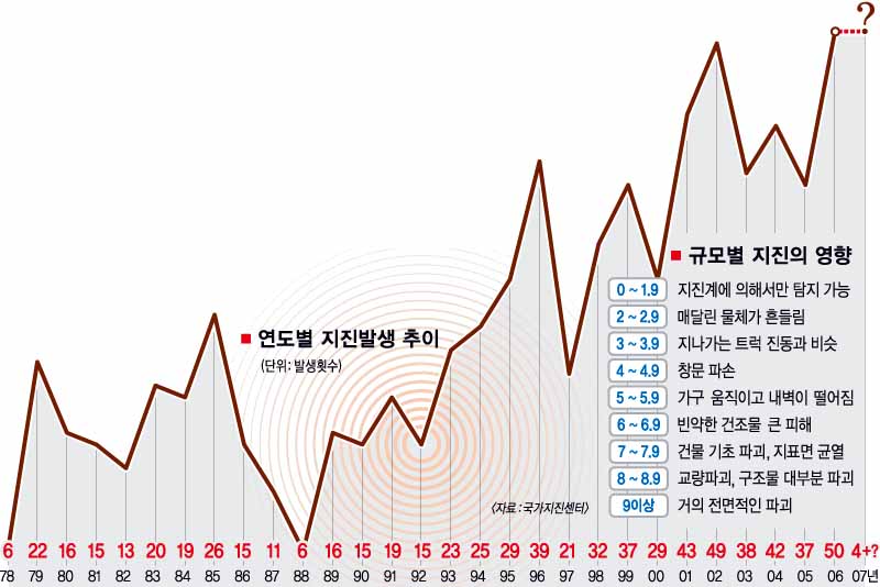2000년대 들어 한 해 평균 지진발생 횟수는 41.1회로 집계됐다.80년대의 한 해 평균 15.7회,90년대 25.5회와 비교해 크게 늘어났다.