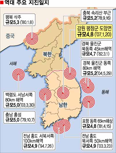 기상대가 첨단장비로 관측을 시작한 1978년부터 2006년까지 진도 4.0 이상 지진은 모두 35차례 발생했다.3.0 이상은 230여차례에 이른다.1978년 9월16일 충북 속리산 부근에서 진도 5.2의 강진이 일어났다.1980년 평북 삭주에서 일어난 지진은 진도 5.3에 달한다. 이 지진은 지금까지 한반도에서 일어난 것 중 가장 강도가 높은 것으로 기록되고 있다.1978년 10월7일 충남 홍성과 2003년 3월30일 백령도 서남서쪽 80㎞ 해역에서는 각각 진도 5.0의 지진이 일어났고 전남 홍도 인근 해상에서는 1994년과 2003년에 진도 4.9의 지진이 발생했다. 지난해에만 진도 2.0∼3.5 사이의 지진이 50차례나 있었다.