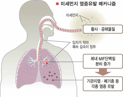 연구팀은 호흡기 외피세포에 미세먼지를 투여하고 이에 따른 인체 내 단백체의 변화를 관찰한 결과, 미세먼지가 기도 상피세포를 자극하면 ‘MIF(대식세포 이동저지 인자) 단백질’이 대량으로 분비되는 것을 확인했다고 밝혔다.MIF 단백질은 염증과 연관성이 있는 물질이다.