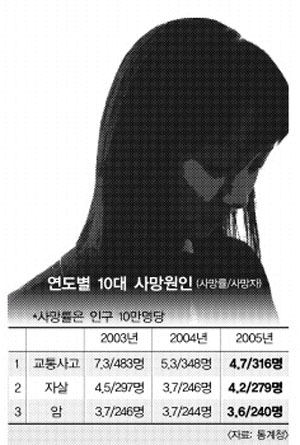 해마다 300명가량의 10대들이 스스로 목숨을 끊는 것으로 나타나 심각한 우려를 낳고 있다. 중·장년층과 달리 10대 자살은 원인이 다양한 데다 사회 안전망 등으로 대처하기 힘들어 대책을 마련하는 것이 시급하다는 게 전문가들의 의견이다.24일 통계청에 따르면 2003년 297명을 기록했던 10대 자살은 2004년 246명으로 약간 줄었지만,2005년 279명으로 뛰어올랐다.