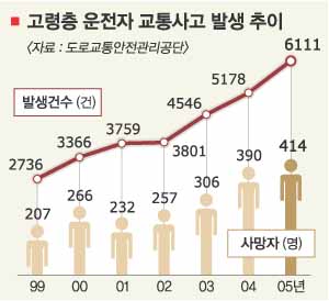 경찰청 산하 도로교통안전관리공단에 따르면 65세 이상 고령층 운전자가 유발한 교통사고는 1995년 1326건에서 2005년 6111건으로 4.6배 증가했다. 특히 2005년에는 2004년의 5178건보다 18%나 늘어나 최근 고령층 운전자의 교통사고가 급증하고 있는 것으로 나타났다.