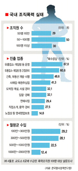 조직 폭력배의 월평균 수입은 400만원, 직무 만족도는 79.3%로 경찰보다 오히려 높은 것으로 조사됐다.