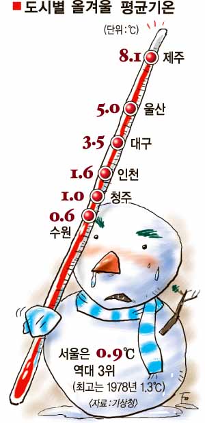 2일 기상청에 따르면 지난해 12월∼올 1월 서울의 평균기온은 0.9도로 78년(1.3도)과 91년(2.1도)에 이어 세번째로 따뜻했다. 인천은 1.6도, 대구는 3.5도, 청주 1.0도, 울산 5.0도, 제주 8.1도를 나타냈다.