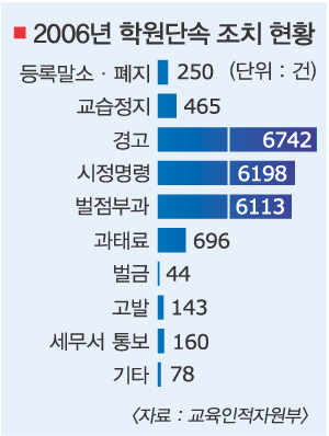 유형별로 보면 가장 강력한 행정처분인 등록말소·폐지 250건, 교습정지 465건, 경고 6742건, 시정명령 6198건 등이었다. 학원들이 가장 무서워한다는 세무서 통보는 160건에 불과했다. 벌금은 44건, 고발은 14건에 그쳤다. 과태료는 696건으로 비교적 건수가 많았지만 부과금 총액은 3억 4344만원으로 학원 한 곳당 평균 49만 3000원에 불과했다. 단속에 걸려 과태료를 내도 거액의 수강료를 받는 학원측에서 보면 ‘새 발의 피’인 셈이다.