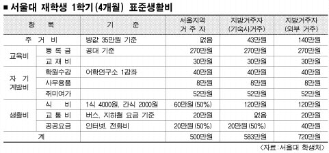 표준생활비는 등록금을 포함해 서울대 학생 1명의 방학중 생활비를 뺀 순수 학기중 생활비만 산정했다.
