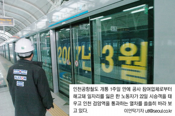 이들은 2003년 12월 공항철도㈜의 수주를 받아 컨소시엄으로 공사에 참여한 외국계기업 A사와 공사가 끝날 때까지 노무계약을 맺고 공항철도 전차 선로와 스크린도어의 변전과 설계, 통신과 전기 공사 감독일을 해왔다. 하지만 회사측이 지난달 22일 갑자기 팀원 50명 중 34명에게 해직 통보를 했다.3년 동안 김포공항∼인천공항 간 40.3㎞를 발이 닳도록 돌아다니며 1단계 공사를 마친 지 딱 1주일 만이었다. 전차 선로 설계와 공사 감독을 맡아 오다 해직된 K(52)씨는 “땀과 열정이 담긴 열차가 개통됐다는데 보람을 느끼지만 한편으로는 다음달 대학 입학을 앞둔 아들의 등록금 420만원을 어떻게 마련할지 막막하기만 하다.”고 고개를 떨구었다.