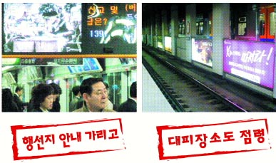 퇴근하는 사람들로 가득찬 지하철 2호선 을지로입구역 승강장에서 회사원 김광석(35)씨가 힘겹게 고개를 숙여 행선 안내 게시기를 보고 있었다. 안내 게시기가 천장에 새로 설치된 안내판에 가려 보이지 않았기 때문이다(사진 왼쪽). 김씨는 “광고만 나오는 안내판 때문에 정작 필요한 정보가 나오는 안내판은 볼 수가 없다.”고 불편을 호소했다.