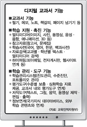 ●디지털 교과서란 현재의 종이 교과서 내용을 디지털화해 전자매체에 수록한 뒤 유·무선 정보통신망을 이용해 이를 읽고, 보고, 들을 수 있도록 한 첨단 교과서다. 기존 교과서 내용은 물론 참고서와 문제집, 사전 등 방대한 학습자료는 물론 동영상과 애니메이션, 인터넷 연결, 가상현실 등 첨단 멀티미디어 기능을 통합 제공한다. 필기 기능과 진도관리, 평가 기능도 갖추고 있다.