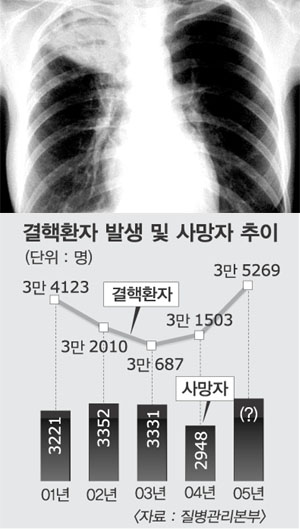 ‘결핵’이 되살아나고 있다. 한때 거의 자취를 감추었던 결핵이 최근 다시 고개를 들고 있다.22일 질병관리본부에 따르면 지난해 새로 결핵에 감염된 환자수는 3만 5361명으로 2004년 이후 3년 연속 늘고 있다. 결핵 신(新)환자수는 2001년 3만 4123명,2002년 3만 2010명,2003년 3만 687명으로 꾸준히 감소하다 2004년 3만 1503명,2005년 3만 5269명으로 상승세로 전환했다.