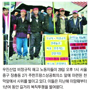 29일 오후 1시 서울 중구 장충동 2가 주한프랑스상공회의소 앞. 지난해 이맘때 해고 통보를 받은 뒤 길거리에 나서 복직투쟁을 벌이고 있는 우진산업 전 비정규직 노동자 6명의 마음은 아직도 한겨울 날씨처럼 꽁꽁 얼어 있었다.