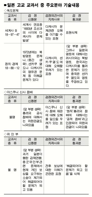 |도쿄 박홍기특파원 서울 김미경 기자| 일본 정부가 내년부터 사용될 고교 2·3학년의 교과서에 독도의 일본 영유권 주장을 한층 강화했다. 또 일본군 위안부의 강제동원 부분은 아예 뺀 것으로 드러났다.