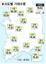 통계청이 4일 발표한 ‘2005년 시·도별 생명표 및 사망원인통계 결과’에 따르면 전국에서 기대 수명이 가장 높은 지역은 서울로 80.4세였다. 기대수명이란 출생한 아이가 앞으로 몇 살까지 살 수 있을지를 평균적으로 예측한 개념이다. 반면 기대수명이 가장 낮은 지역은 경남으로 77.5세로 나타났다. 서울보다 2.89세, 전국 평균인 78.6세보다도 1.13세 낮은 수치다. 기대수명은 수도권이나 광역시가 시·도 지역보다 더 높은 것으로 파악됐다. 부산이 77.8세, 대구 78.5세, 경기 79.2세 등으로 강원(77.6세), 충북(77.6세)지역보다 높게 나타났다.