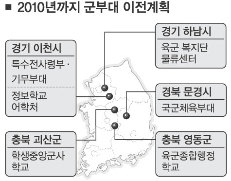 학생중앙군사학교(학군교)는 충북 괴산군, 육군종합행정학교(종행교)는 충북 영동군으로 옮겨가며, 정보학교 어학처와 육군 복지단 물류센터의 이전지는 각각 경기 이천시와 하남시로 결정됐다. 국방부는 10일 김영룡 차관 주재로 정책회의를 열고 송파 군부대 이전지역을 확정해 발표했다. 김광우 군사시설기획관은 “이달 중 각 부대와 토지공사가 부대이전 합의각서를 체결한 뒤 기본·실시설계를 거쳐 2008년 7월 부대별로 공사에 착수할 계획”이라고 밝혔다. 이전은 공사가 끝나는 2010년쯤 마무리된다.