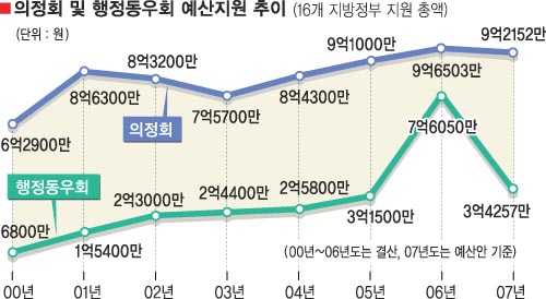 2000년부터 올해까지 8년간 지방정부들이 의정회에 지원한 보조금은 67억 2105만원, 행정동우회에 지원한 보조금은 23억 7247억원에 이른다. 지원 규모도 대폭 늘어나고 있다.