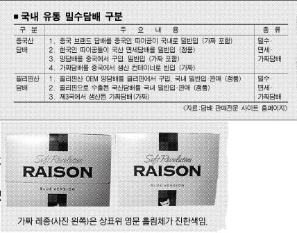 국산 ‘더원’의 국내 유통 가짜담배는 담뱃갑 정면 왼편의 무지개 중 붉은색과 보라색이 진품에 비해 인쇄가 흐리다.‘레종’은 상표 위 영문 흘림체가 진품에 비해 진하다. 외국산 ‘던힐’의 경우 정면 X자형 홀로그램이 없고, 브랜드 글씨체도 차이가 난다. 측면 글자체와 크기, 회사 전화번호 위치도 제각각이다. 맞은편 측면의 바코드 숫자 크기도 다르다. 최근 급증한 면세용 ‘에쎄’의 역수입 밀수품은 측면에 위조된 라벨을 덧붙인 흔적이 엿보인다. 측면 상부 비닐을 예리한 칼로 자르고 그 위에 흰색포장지를 덧붙여 면세용 표식을 감춘 것이다. 포장비닐을 살짝 밀면 쉽게 벗겨지는 특징이 있다.