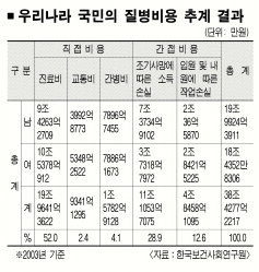 질병으로 인해 한해 동안 발생하는 사회·경제적 비용이 38조원을 웃도는 것으로 나타났다. 이 가운데 진료비는 20조원에 육박해 절반을 넘었다. 간병비와 교통비도 각각 1조 5000억여원,9000억여원에 달했고, 조기사망에 따른 소득손실액은 11조여원, 입원·내원에 따른 작업손실액은 4조여원에 이르렀다.