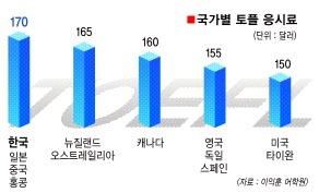 23일 서울신문의 의뢰로 이익훈 어학원이 토플시험 사이트를 통해 주요 국가에 토플 시험을 직접 접수한 결과, 우리나라 토플 iBT(인터넷 방식 시험) 응시료는 170달러(약 15만 8000원)로 미국·타이완 150달러, 독일, 영국, 스페인 155달러에 비해 15∼20달러(1만 4000∼1만 9000원)가량 비쌌다. 일본, 중국, 홍콩도 우리나라와 같은 수준인 170달러였다. 교육인적자원부의 지난해 국감자료에 따르면 우리나라는 토플과 토익 시험에 2003년도부터 2005년도까지 3년 동안 총 564만명이 지원,2236억원의 응시료를 ETS에 지불했다. 수험생들은 국내 응시료가 다른 나라에 비해 비싼 이유에 대해 납득하기 어렵다는 입장이다. 미국 유학을 준비하고 있는 김모(24)씨는 “토플 응시료가 다른 시험에 비해 2∼3배 비싼 것도 불만이지만 미국이나 타이완에 비해 왜 비싼지, 이유를 잘 모르겠다.”고 불만을 토로했다. 그는 “토플 응시 취소 비용도 50%나 돼 양도를 하는 경우가 많고, 이로 인한 사기도 심각한 문제가 되고 있다.”고 주장했다.