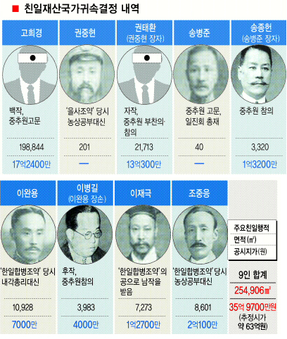 이완용과 송병준 등 친일파 9명의 재산이 국가로 환수된다. 친일 행위를 한 대가로 모은 재산이 국가로 귀속되는 것은 처음이다.