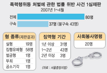 전체 80건 중 절반가량인 37건의 피고인이 구속 상태로 수사나 재판을 받았다. 또 1심 선고 결과 실형을 선고받은 경우는 전체 23.7%인 19건에 불과했다. 나머지 사건 중 무죄·벌금형·공소기각이 각 1건씩이었고,58건은 집행유예가 선고됐다. 집행유예가 선고된 58건 중 20건에는 80∼240시간씩의 사회봉사 명령이 함께 내려졌다.