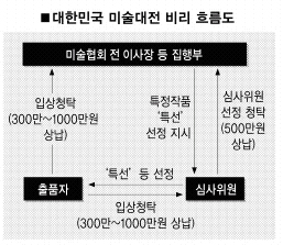 미술계에서는 입선 300만∼500만원, 특선 1000만∼2000만원, 대통령상을 받으려면 상금(3000만원)을 포기하고 3000만원을 더 줘야 한다는 소문이 나돌 정도로 뇌물 수수가 만연해 있다는 게 경찰의 설명이다.