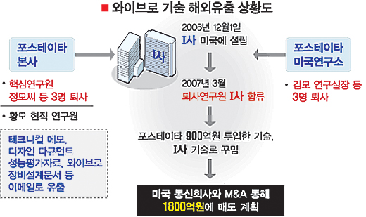 서울중앙지검 첨단범죄수사부(부장 이제영)는 20일 국가정보원과의 공조로 국내 IT업체인 포스데이타가 개발한 와이브로 관련 핵심기술을 빼내 미국 통신회사에 팔아 넘기려 한 혐의로 이 회사 전직 연구원 정모(39)씨 등 3명과 현직 연구원 황모(45)씨를 구속기소했다. 또 이 회사 연구원 출신으로 미국에 유사 IT 기술업체인 I사를 설립하고 기술 유출을 주도한 김모씨 등 3명에 대해 국내 소환을 추진 중이다.