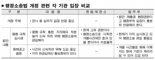 대법원은 또 일선 행정기관에서 명령이나 규칙을 이용한 처분이 늘고 있어 명령·규칙 심사권을 행정소송으로 편입시킬 필요가 있고, 사건을 신속하게 해결하기 위해선 화해·권고제도 역시 도입해야 한다고 말한다.