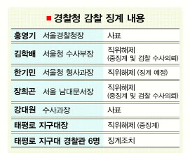 이와 관련, 홍영기 서울경찰청장은 이날 조직내 갈등과 불협화음 등에 따른 총체적인 책임을 지고 사표를 제출했다. 강대원(전 남대문경찰서 수사과장) 경정도 사표를 냈다. 경찰은 김학배 서울청 수사부장, 한기민 서울청 형사과장, 장희곤 서울 남대문경찰서장을 직위해제하고 중징계하기로 했다.