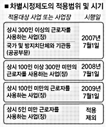 내년 7월 상시 100인 이상∼300인 미만 사업장,2009년 7월 상시 5인 이상∼100인 미만 사업장 등으로 확대된다.