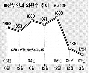 국민건강관리공단에 따르면 전국 산부인과 의원 수는 지난해 6월 1857개에서 올해 3월 1794개로 급격히 줄었다.8개월 만에 67곳이 문을 닫은 셈이다. 대한산부인과의사회 관계자는 “산부인과 폐업은 낮은 출산율로 인해 경영이 힘들기 때문이며, 특히 한번의 실수로 병원이 문을 닫을 수도 있는 분만 수술에 대한 높은 위험률도 경영을 어렵게 한다.”고 밝혔다.