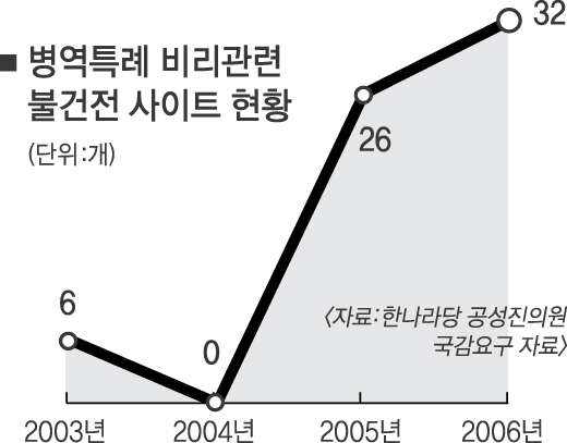 21일 서울신문이 취재한 결과 병역특례요원들이 만든 것으로 추정되는 인터넷 ‘실사 사이트’ 등에는 병무청 실사 정보에 대한 글이 수백건 발견됐다. 이 게시판에는 “○○지역 △△동에서 병무청 실태조사하고 있으니 주의 바람”,“우리 지역에서 병무청 인사담당자와 특례요원 상담하고 갔음”, 심지어는 “오늘 실사를 나온 사람은 깐깐하기로 소문난 □□□씨가 아니니 안심하라.”라는 등의 내용이 게시돼 있었다.