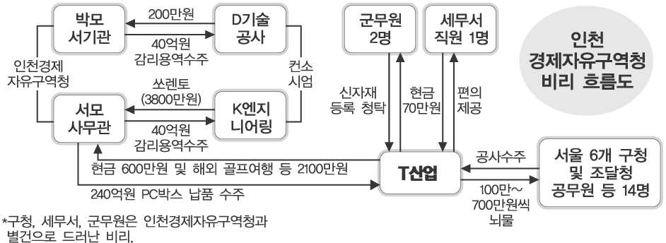 업체로부터 뇌물과 고급 승용차, 해외 골프여행 접대 등을 받아 경찰에 붙잡힌 이들은 인천경제자유구역청 공무원 외에도 서울시 산하 6개 구청, 조달청, 환경관리공단, 서울 모 세무서, 국방부, 유명 건설업체 S건설 직원도 포함됐다. 경찰 수사 과정에서 서울 6개 자치구 공무원들도 각 자치구 관내 공사 청탁을 대가로 T산업으로부터 100만∼700만원씩의 뇌물을 받은 것으로 드러났다. 경찰은 T산업이 공무원들을 A·B·C 등급으로 나눠 체계적으로 관리했음을 뒷받침하는 장부를 압수해 금품을 받은 공무원이 더 있는지 조사하고 있다.
