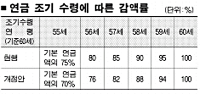 반면 연금을 조기에 받는 사람은 지급 개시일 5년 전 연금을 신청하면 지금까지 수령액의 75%를 받았지만 앞으로는 70%만 받는다. 현행법상에는 연금을 압류할 수 있지만 내년 1월부터는 월 120만원 이하의 연금액은 압류가 금지된다. 시행안은 또 국민연금 가입자가 공무원연금 등 다른 공적연금에 가입하면 반환일시금을 지급하지 않고 60세 때 연금을 받도록 했다.