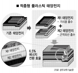 광주과학기술원 이광희(47) 교수팀은 12일 세계 최고의 에너지 전환효율인 6.5%를 올리면서도 친환경적이고 낮은 제작단가로 경제성까지 갖춘 유기물 플라스틱 태양전지를 개발했다고 밝혔다. 이번 연구성과는 세계 최고 귄위의 국제 과학저널인 ‘사이언스’ 13일자에 게재됐다.