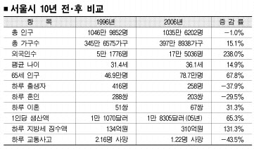 서울 인구는 1996년 1046만 9852명에서 지난해 1035만 6202명으로 1% 정도 줄었다. 그러나 외국인의 수는 5만 1776명에서 17만 5036명으로 238%나 늘었다. 이에 따라 외국인의 비율도 서울 인구 50명에 1명꼴로 늘었다. 지난해 65세 이상 노인의 수는 10년 전의 46만 9000여명에서 78만 7000여명으로 늘었다. 반면 저출산 현상에 따라 지난해 하루 평균 출생아 수는 416명에서 258명으로 크게 줄었다. 이런 변화로 서울 시민의 평균 연령은 31.4세에서 36.1세로 높아졌다.