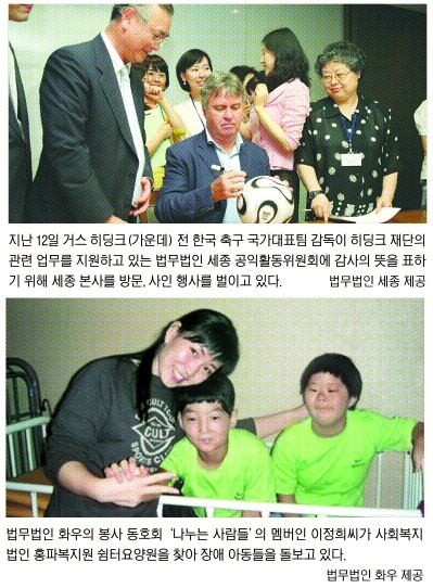 법무법인 세종 역시 지난해 공익활동위원회를 발족했으며, 올 1월에는 변호사와 직원들이 자발적으로 참여하는 공익활동단체 ‘세종사랑나눔회’를 만들었다. 공익활동위 소속 변호사들은 거스 히딩크 재단의 업무도 무료로 지원하고 있다. 히딩크 재단은 불우아동과 청소년 지원 법인이다. 공익활동위원회를 구성해 9년째 활동중인 김앤장은 불우이웃돕기와 장애우시설 지원에 중점을 두고 있다. 최근에는 ‘공익활동연구소’까지 만들어 체계적인 공익활동에 나서고 있다. 올 4월 공익활동위원회를 출범한 법무법인 광장의 변호사들은 학교에서 법교육 명예교사로 활약하거나 미혼모·부에게 법률 서비스를 제공한다.
