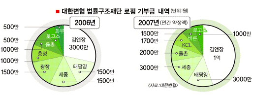 이진강 변협 회장은 올해 취임하자 마자 산하 법률구조재단의 기금 확충에 나섰다. 이 회장은 로펌으로부터 올해 2억 2000만원의 기부금을 약속받았고, 앞으로 5년 동안 받기로 한 기부금은 11억 1000만원. 지난해 기부금은 1억 500만원에 불과했다.