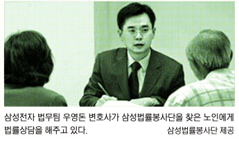 김 변호사는 “A씨 가족들이 버스로 2시간 정도 떨어져 있는 피해자 집을 찾아가 사죄 끝에 합의를 얻어냈고, 피해자측으로부터 진정서도 받아냈다.”면서 “변론 과정에서 피해자측으로부터도 신뢰를 얻었기 때문에 봉사단이 간접적으로 화해를 권한 것이 영향을 미친 것 같다.”고 말했다. 지난해 3월 민간기업 최초의 법률봉사단으로 발족한 삼성법률봉사단의 무료 법률상담사례는 7000여건. 현재 진행 중이거나 종결된 형사사건 무료변론은 75건이다.70명 안팎의 국내 변호사들 거의 전원이 봉사활동에 참여하고 있다. 무료변론은 생계형 범죄자나 장애우 등 변호사를 선임할 능력이 없는 소외계층을 대상으로 한다. 한 사건을 맡으면 항소·상고심까지 책임진다.
