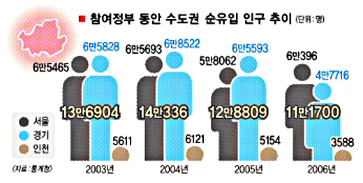 수도권 내에서의 이동을 제외한 서울의 인구는 2003년 6만 5465명을 시작으로 지난 4년간 24만 4000명이 순유입됐다. 경기도는 24만 7600여명, 인천은 4년간 2만 470여명 순증가했다.