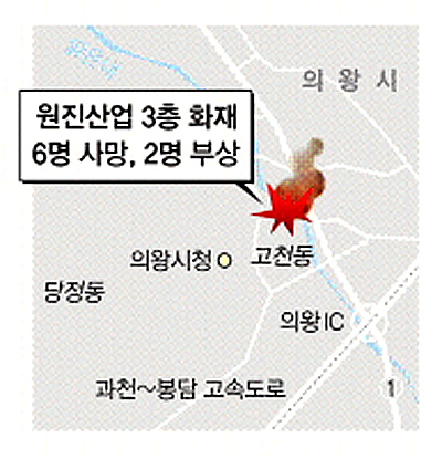 9일 오후 8시35분쯤 경기도 의왕시 고천동 화장품케이스제조업체인 원진산업 3층 작업장에서 폭발과 함께 화재가 발생, 박형순(50·여)씨와 엄경자(60·여)씨 등 여직원 6명이 유독가스에 질식해 숨졌다.