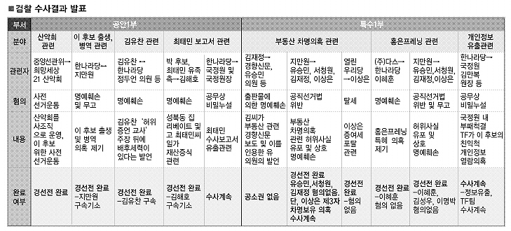검찰은 미진한 부분은 수사를 계속할 것이라고 말한다. 중간수사 발표를 통해 어느 정도 궁금증을 해소한 만큼 고난도의 민감한 사안에 대해 총력을 기울일 수 있게 됐다는 판단이다. 하지만 경선을 통해 후보가 최종 확정된 이후 해당 후보측 참고인 등이 검찰 소환에 순순히 응하기를 기대하기 어렵기 때문에 ‘말뿐인 수사’로 끝날 가능성도 있다는 지적이다.