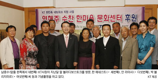 한편 KT는 ‘나라사랑’ 사회공헌 캠페인의 하나로 중앙아시아로 강제이주한 우즈베키스탄과 연해주 지역 고려인 동포를 돕는 사업을 펼치고 있다. 지난달 초 남 사장은 우즈베키스탄 타슈켄트를 방문,16년간 고려인에게 한글을 가르쳐 온 ‘세종한글학교’에 PC 등 정보기술(IT) 장비 등을 전달했다.