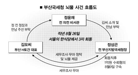 정윤재 전 청와대 의전비서관이 세무조사 대상이던 부산지역 H토건 김모 대표와 정상곤 부산지방국세청장(현 국세청 부동산납세관리국장)의 ‘뇌물’만남을 주선했는지 여부와 그 배경 등을 놓고 궁금증이 커지고 있다.