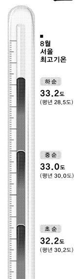 낮 최고기온도 평년에 비해 훨씬 높았다.8월 초·중·하순 낮 최고기온이 평년의 경우 각각 30.2도,30.0도,28.5도로 낮아지고 있으나 올 8월에는 각각 32.2도,33.0도,33.2도로 하순이 될수록 오히려 높아졌다.