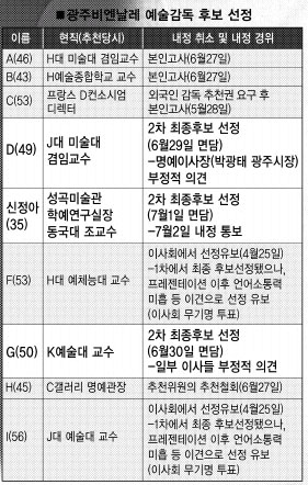 그는 박광태(광주시장) 명예이사장의 개입 의혹과 관련해 “신씨를 포함해 최종 후보로 선정된 3명 중에서 D(49·J대 미술대 겸임교수)씨에 대해서만 박 시장이 문제가 있다고 했다. 신씨에 대해서는 알아서 하라고 했다.”고 밝혔다.