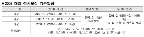 2008학년도 정시 모집에서 전국 199개 4년제 대학이 18만 72명을 모집한다. 교육부가 권고한 내신 실질반영비율 30% 이상 지침을 지킨 대학은 177개 대학으로 전체의 88.9%를 차지했다. 고려대와 연세대, 성균관대, 서강대, 중앙대, 한양대 등 일부 사립대 등은 내신 비율 권고치 30%에 크게 못미친 17∼23% 수준을 보였다. 한국대학교육협의회는 4일 각 대학별 모집인원과 학생부 반영비율 등을 담은 2008학년도 정시 모집 요강을 발표했다. 정시모집 요강은 대교협 대학진학정보센터 입학정보 홈페이지(univ.kcue.or.kr)에 게재된다.정시 모집 인원은 총모집 계획인원 37만 8268명의 47.6%로 전년의 18만 7325명에 비해 7253명 줄어든 수치다. 모집 인원은 수시 1학기와 수시 2학기 합격자 등록 결과에 따라 다소 늘어날 수 있다. 바뀌는 사항은 대학별로 입학원서 접수 전에 모집단위의 모집 인원을 수정 공고하게 된다.