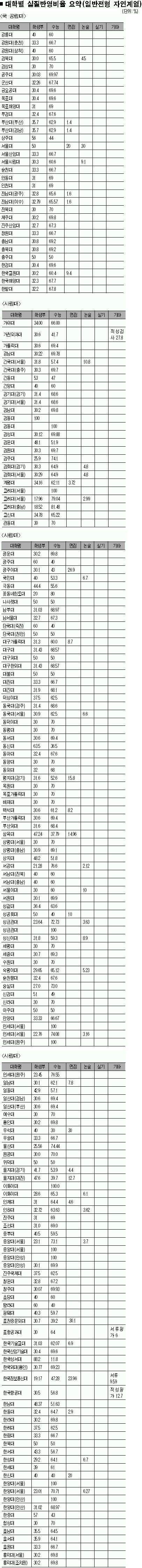 군별 모집인원은 ▲‘가’군 130개 대학 6만 6241명 ▲‘나’군 137개 대학 6만 6502명 ▲‘다’군 135개 대학 4만 7329명이다. 국공립 대학이 42개 대학 4만 8192명(26.8%), 사립대학이 157개 대학 13만 1880명(73.2%)이다. 전년에 비해 국공립대는 1.4%포인트 줄고, 사립대는 1.2%포인트 늘어났다. 일반전형이 199개 대학 16만 4590명(91.4%), 특별전형은 151개 대학 1만 5482명(8.6%)이다.