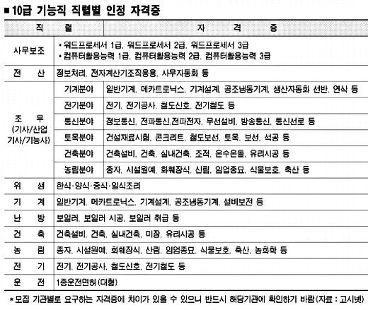 그러나 10급을 준비하기에 앞서 자격증 준비가 필수다.7·9급과 달리 가산점이 아니라 보통 사무직은 워드프로세서나 컴퓨터 활용능력 자격증을, 조무직은 기술 관련 자격증을 필수항목으로 요구하는 경우가 많다. 이를 미리 확인하고 지원해야 한다.