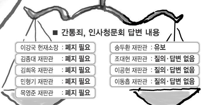 이 소장은 지난 1월 국회 인사청문회에서 “개인적으로는 시대도 변하고 국민적 합의가 되면 처벌 문제는 근본적으로 검토하는 게 바람직하지 않나 싶다.”고 밝혔다. 또 김종대·김희옥·민형기·목영준 재판관 역시 간통죄 폐지에 가까운 입장을 보였다. 폐지에 긍정적 의견을 보인 재판관이 5명이다. 위헌 정족수가 6대3인 것을 감안하면 재판관 한명만 더 위헌 의견을 낼 경우 간통죄는 형법전에서 사라지게 된다. 다만 폐지 의견을 냈던 재판관들 중에도 ‘입법적 해결이 필요하다.’는 입장을 밝힌 재판관도 상당수여서 섣불리 판단하기에는 쉽지 않다는 지적이다.